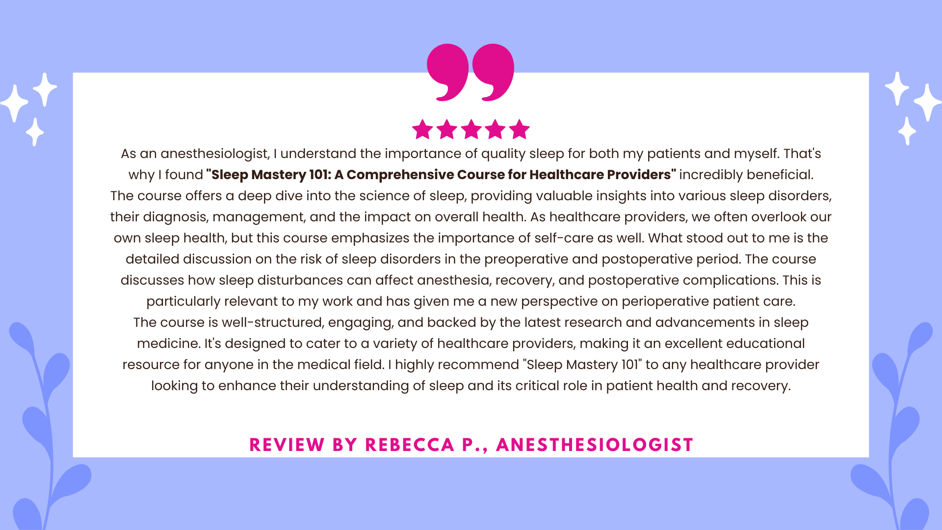 As a sleep specialist, you're already aware of the importance of good sleep for overall health. The "Sleep Mastery 101" course will provide an opportunity to delve deeper into the latest research and advancements in sleep medicine. This course will help you stay at the forefront of your field, ensuring that you can provide the best possible care to your patients.